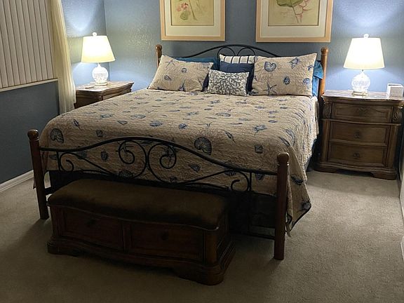 The master bedroom is very large with a king-size bed, a large double closet, a full en suite bathroom. The second bedroom has a queen-size bed a large closet with plenty of storage space for clothing and other belongings. There is also a second full bathroom with a tub/shower combination, vanity, and mirror. All main rooms have ceiling fans installed. The flooring throughout the house is a combination of carpet and tile for comfort.
