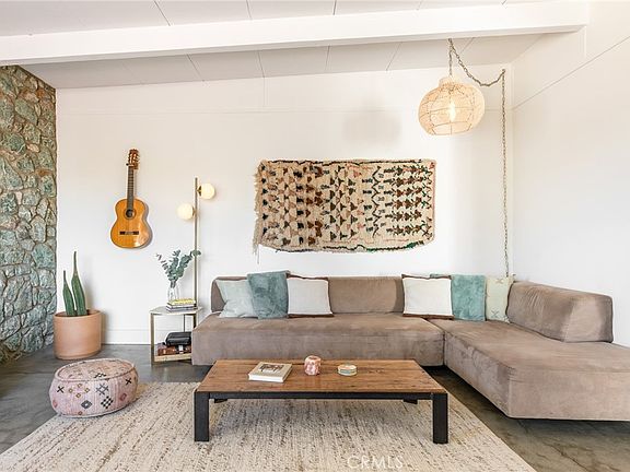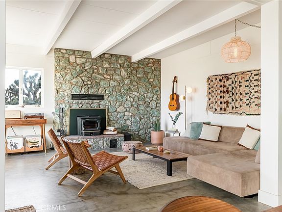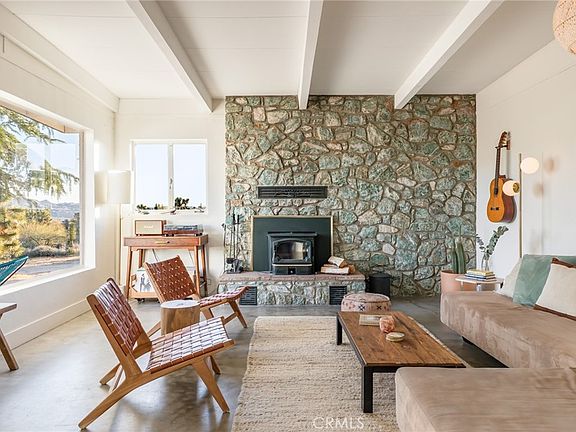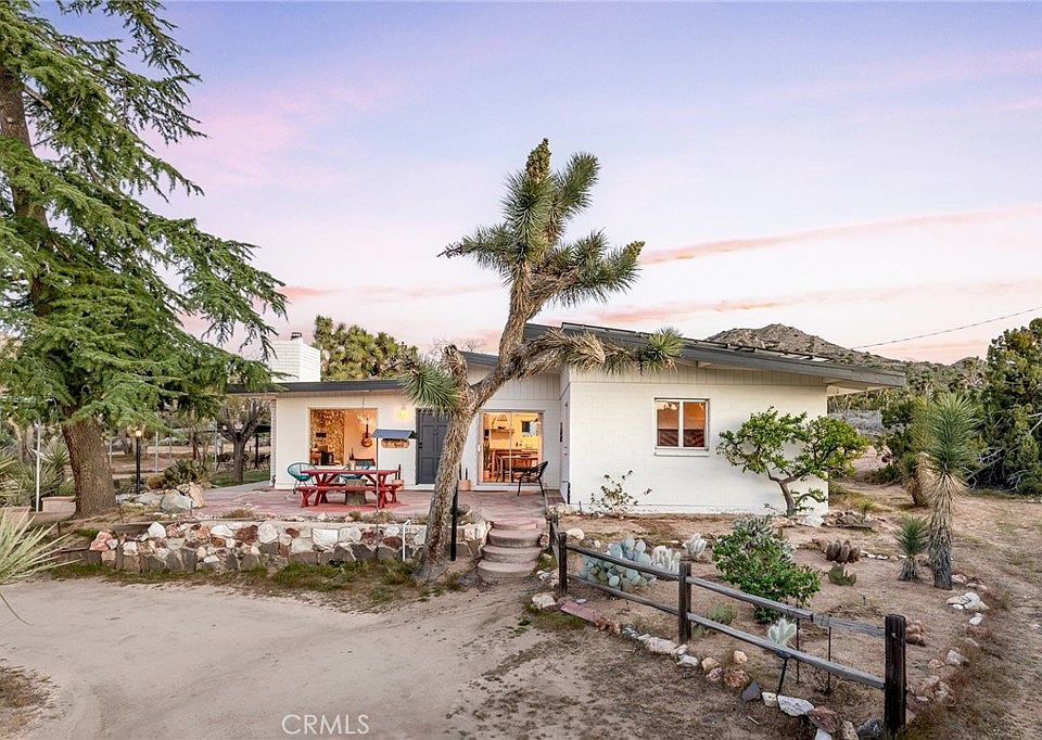 What's it like to live in an enchanted forest? Nestled on a gentle slope surrounded by over 300 Joshua trees on 2.25 sprawling acres, this extraordinary 1957 mid-century modern home is a park-like retreat. Inside, the modest footprint feels expansive thanks to soaring cathedral ceilings and mountain views in every direction. Original details like casement windows, a stacked stone fireplace, a vintage woodstove, and wood beamed ceilings have been lovingly maintained while modern comforts like energy-efficient mini splits and a solar system have been added for year-round enjoyment. A thoughtful floor plan invites you to spread out and stay a while; imagine yourself at game night around the fireplace, bird-watching at the picture window, preparing a feast in the spacious kitchen, or curling up for a catnap in one of the generously-sized bedrooms. Take in the vibrant sunset colors over the snow-capped San Gorgonio mountains from your front patio canopied by a towering 100 ft fir tree. Everything is just a little bit cooler here thanks to the 3,500 ft elevation - you may even forget you’re in the desert! Speaking of cool, Instagrammable moments abound from the ultra-fab octagon deck & hot tub around back, enveloped by Joshua trees & starry skies. Electricity bills are yet another thing you won’t need to worry about while enjoying your oasis, thanks to the 8.4 kW OWNED solar system grandfathered into NEM 2.0. This property consists of one 1.98 acre parcel with an additional .27 acre attached lot for a total of 2.25 lush fully fenced acres just minutes from downtown Yucca Valley and Joshua Tree National Park. A shed for all your storage, covered parking suitable for an RV or XL patio, and a detached garage with a workshop ripe for ADU conversion round out this incredible property. This special sanctuary is being sold turnkey with all furnishings, ready to become your weekend escape, your money making short term rental, or your forever home.