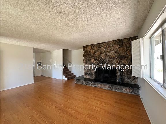 This recently rejuvenated 2-bedroom, 1.5-bath, two-story apartment offers approximately 1,126 square feet of comfortable living space and comes with a 2-car garage and its own laundry room. It features a spacious kitchen with newly installed Quartz counter tops, ample freshly painted cabinets with modern hardware, newly installed vinyl plank flooring, and room for a kitchen table. There is also a dining area adjacent to the kitchen and a cantilever dining bar that can serve as a buffet. As you enter the apartment, you will find an entry area and a spacious living room with vinyl plank flooring, a decorative natural rock fireplace that gives a midcentury vibe, and a wall AC unit.