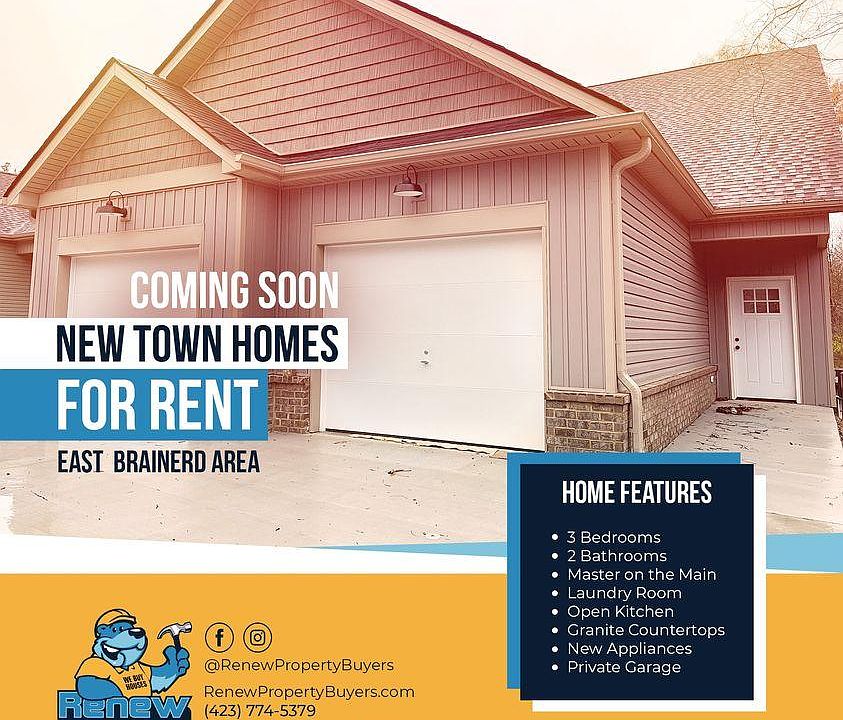 Welcome to Graham Rd! A spacious new construction 3-bedroom 2- bathroom townhouse! This beautiful home with designer floor plans accentuated with premium finishes is located in a quiet neighborhood, near all the amenities in East Brainerd. The Unit has the master suite on the main level and two more spacious bedrooms with another full bathroom upstairs. Each Unit has a one-car garage included for convenient winter weather parking. It also includes washer/dryer hookups in its own separate laundry room. Contact us today to lease your brand new luxury townhome in East Brainerd! Landlord pays for landscaping and appliance repairs. Tenants are responsible for all utilities, including electricity, water, sewer, trash, and pest control. Pets are considered with owner approval. No dangerous breeds. There is a $250 refundable pet fee per animal up to 2 plus additional $25 monthly pet rent. Due at signing: $2100 deposit.