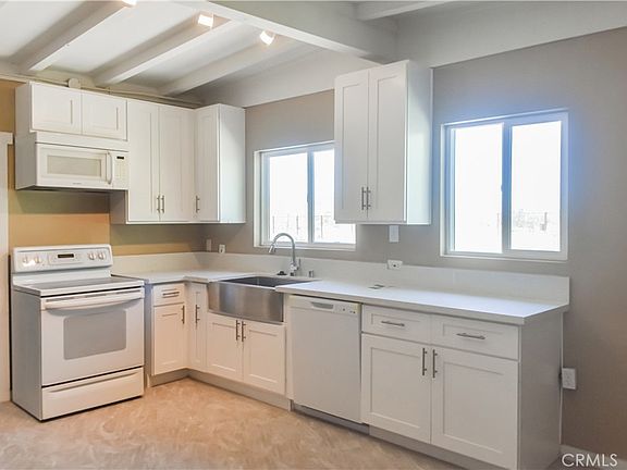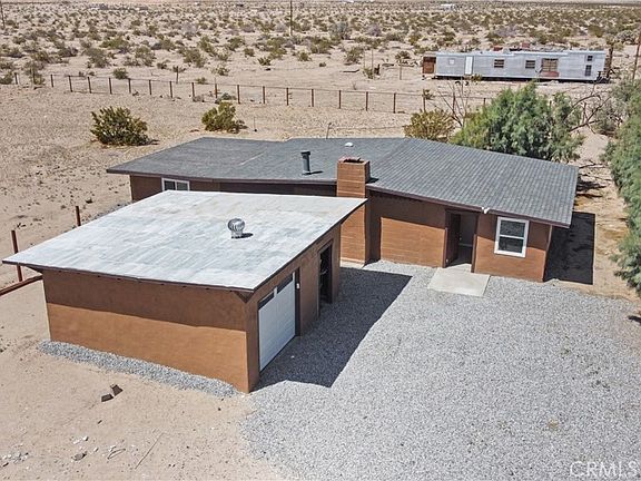 Nestled on a private road in the serene Wonder Valley section of 29 Palms, this beautifully remodeled 3 bedroom, 1 bathroom home offers tranquility and modern comfort on 5 sprawling private acres. The home features a thoughtful layout with bedrooms strategically positioned on either side of the house for privacy. Central to the home is a stunning great room with high, beamed ceilings and a striking brick fireplace, creating a cozy yet open space for relaxation and entertaining. This area seamlessly integrates with the newly updated kitchen, outfitted with chic quartz countertops, new cabinetry, and modern appliances, alongside a remodeled bathroom and new, stylish rectangular tile flooring throughout the entire residence. Home is equipped with efficient mini-split units in the great room and additional wall-mounted air conditioners in the bedrooms, ensuring comfort throughout the seasons. Adjacent to the house, a detached garage features roll-up doors, providing ample space for storage, a workspace, and laundry hookups. The property's exterior has been freshly painted, new septic tank, and the home is serviced by a recently inspected hot water well enhanced with a new booster pump, ensuring a reliable water supply. The land itself is partially fenced, offering vast potential for expansion or simply enjoying the star-filled desert nights. Just a short distance away, the Wonder Valley Community Center enhances local life with amenities including a park with a children's playground, sports court, picnic areas, and BBQ facilities. The center also supports community engagement by renting out space for special events and offering a lending program for books, VHS tapes, and DVDs. This remarkable property promises a blend of peaceful living with the convenience of community amenities nearby, making it a perfect escape to the beauty of the desert.
