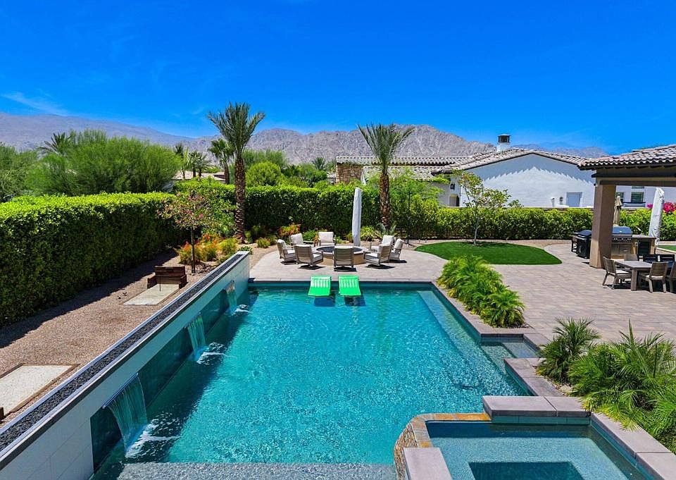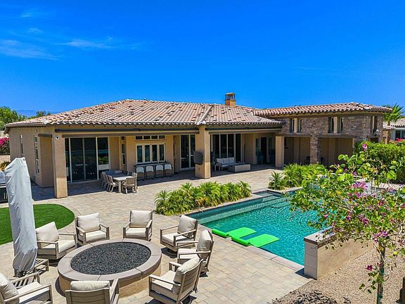 Welcome to Griffin Ranch--a premier, guard-gated community in La Quinta that caters to those who expect nothing less than the best. Perfectly positioned on a premium south-facing lot, this stunning estate is designed for seamless indoor-outdoor living and entertaining, surrounded by panoramic mountain views and lush, maintenance-free landscaping.From the moment you arrive, the attention to detail is undeniable--custom hardscaping, elegant pavers, and mature desert flora set the tone for the luxury lifestyle that awaits.Step outside into a backyard oasis curated for relaxation and recreation alike. Whether you're soaking in the sparkling saltwater pool with Baja shelf, unwinding in the spa, or enjoying friendly competition on the bocce court or horseshoe pit, every element is crafted for comfort and entertainment. Grill poolside in your outdoor kitchen with built-in BBQ, host unforgettable evenings by the open-air firepit, or toast with friends at the custom bar under the covered patio--this home was built for moments that matter.Inside, expansive slide-away glass doors with Phantom exterior screens create a true indoor-outdoor experience, flowing from the elegant great room to the patio beyond. The professionally designed interior is light, airy, and anchored by a chef's kitchen featuring premium stainless steel appliances, a double oven, built-in fridge, oversized island, walk-in pantry, and stylish granite finishes. The open-concept design is complemented by a wet bar with wine cooler, ideal for entertaining guests before a night out--or in.The primary suite offers a tranquil escape with a spa-inspired bath and generous walk-in closet. Three spacious guest bedrooms ensure friends and family feel right at home, while a versatile bonus room can easily flex into a home office, media room, or fifth bedroom. Every space has been elevated with smart home features, custom lighting, designer window treatments, and solar panels for energy efficiency and comfort year-round.A four-car garage offers room for vehicles, golf carts, and storage--an exceptional find in the desert!As a resident of Griffin Ranch, you'll have exclusive access to the community's state-of-the-art clubhouse, offering tennis & pickleball courts, a Jr. Olympic-size pool, fitness and Pilates studios, billiards, BBQ pavilions, dog park, and putting green--a social and active lifestyle built right into your neighborhood.