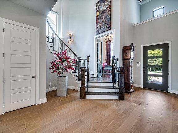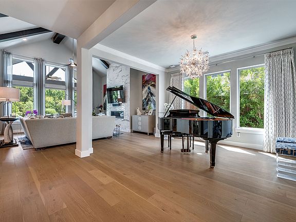 Step inside to a bright, open floor plan with soaring ceilings, a formal dining space, and a beautiful gas fireplace in the living room that creates a warm and inviting atmosphere. Walls of windows flood the home with natural light, highlighting the stunning finishes throughout.