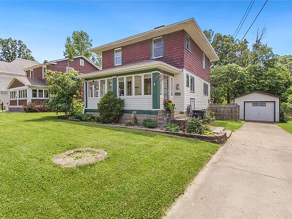 Welcome to this delightful two-story home, built in 1921, nestled in a picturesque and historic neighborhood. This residence beautifully combines the allure of the past with the conveniences of modern living. As you approach, the curb appeal is immediately evident. The exterior boasts a classic architectural style with a welcoming front porch, perfect for enjoying a morning coffee or an evening chat. Step inside, and you are greeted by a warm and inviting atmosphere. The original hardwood floors extend throughout the main living areas, exuding character from this era. The living room, anchored by a beautiful electric fireplace, offers a cozy spot for relaxing. Completing the main level is a sizeable formal dining room, updated kitchen, and even a coat closet large enough to convert into a ½ bath! Ascend the beautifully crafted staircase to the second floor, where you will discover the three bedrooms with hardwood flooring and full bath. The fenced-in backyard is an oasis, featuring a large deck area ideal for hosting summer barbecues. The lush lawn and mature trees provide shade and a sense of privacy. A detached garage offers additional storage and parking space. Situated in a friendly neighborhood, it offers easy access to a range of amenities. Recent updates include:2021~bathroom renovation (new tub/shower, flooring, shelving, mirror, light fixtures, vanity), interior paint throughout, removed carpeting from upper level and stairs, kitchen updated (painted cabinets, new hardware, lighting), refrigerator, washer, dryer; 2022~landscaping (fire pit, hammock area, flower beds), painted front porch; 2023~fireplace update (mantel, wall sconces, electric insert, tiled hearth), deck painted; 2024~floor trim, basement paint. With its rich history, modern updates, and prime location, it truly offers the best of both worlds. Call today!