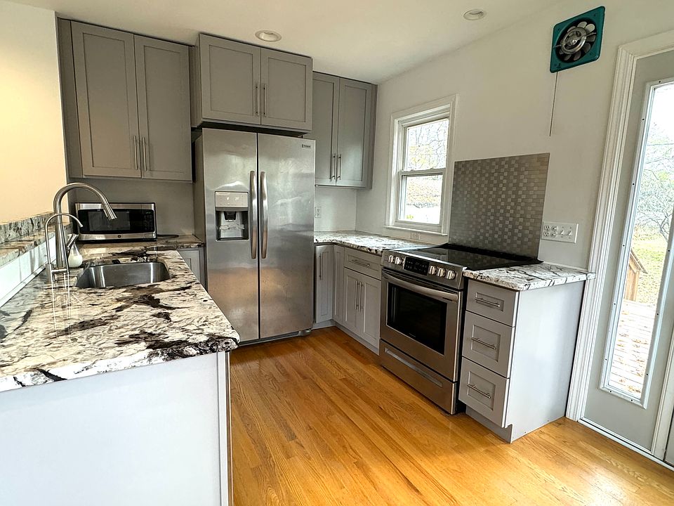 This house has a beautiful kitchen with stainless steel appliances, granite countertops, gray cabinets, and a reverse osmosis water filter. Upstairs is a light filled living room, two bedrooms, and a full bathroom. Downstairs is a finished and carpeted basement with a large recreation room, an additional bedroom with an egress window, another large, full bathroom, and in-unit washer and dryer for laundry. Central A/C keeps you cool in the summer.