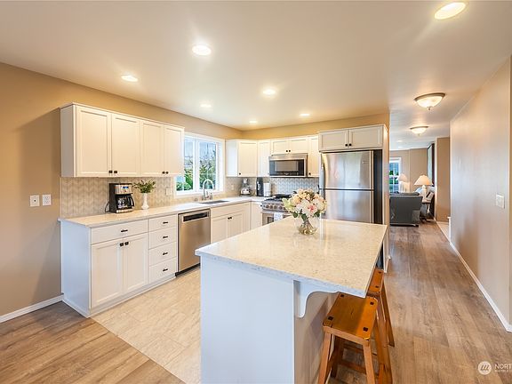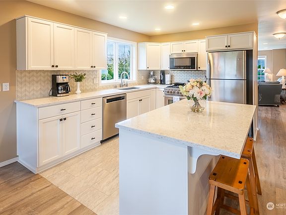 Located on the desirable west side of Lynden, this single-level home sits on a spacious lot with many appealing features. Step inside to discover new gorgeous laminate floors and updates throughout. The kitchen features an island with quartz countertops, complimented by stainless steel appliances and a large high-end undermount sink. With three bedrooms, two bathrooms, and separate living and family rooms, this home offers both comfort and convenience. The furnace was recently replaced and house has AC. There is an abundance of storage through entire house. Outdoor enthusiasts will appreciate the privacy of the patio, large backyard, garden shed & raised garden bed. Located close to downtown, trails, shopping, & restaurants.