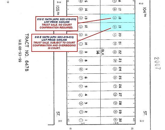 Probate Sale. Subject to Court Confirmation and Overbidding in Court. Rare opportunity to own a fixer 2-bed, 2-bath home approx. 1,366 SF living area on a 5,392 lot SF with 3 car garage in Broadway-Manchester. Title shows 1 bed 1 bath only. Buyer to independently verify the accuracy of the square footage, bedroom/ bathroom count, lot size or lot lines/dimensions, permitted or un-permitted spaces. The adjacent lot located at 810 E 104th St is also owned by the same trust, and is listed for sale separately (MLS#: 25602679). They don't need to be purchased together but there's a unique opportunity to purchase two side-by-side parcels at the same time. Sale of 810 E 104th St. is No Court confirmation required. Once in a life-time opportunity for the right investor with the right vision, to acquire this home at a great price and convert it into the true gem it can be, and realize substantial benefits. Current tenant(s) are on a month-to-month tenancy, paying $2,039.50 per month. The property needs rehab and updating. Just minutes away from Glenn Anderson FWY (I-105) and Harbor FWY (I-110), parks, restaurants and schools. Sold AS IS and WHERE IS, with all faults, and without warranty, express or implied, with current tenant(s) in place. Seller will not be responsible for any repairs, inspection reports, termite work, or mandatory government retrofit requirements prior to closing. Buyer to conduct their own investigations and assume all responsibilities for making the necessary repairs to the property. Seller is a Successor Trustee, unrelated to the property owner, and cannot make any representations as to the condition or history of the subject property.