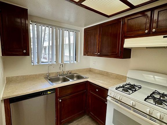 The modern kitchen is equipped with a stove and dishwasher, making meal prep and cleanup effortless.
