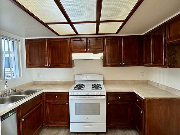 The kitchen is equipped with hardwood cabinets, a stove and dishwasher, making meal prep and cleanup effortless.