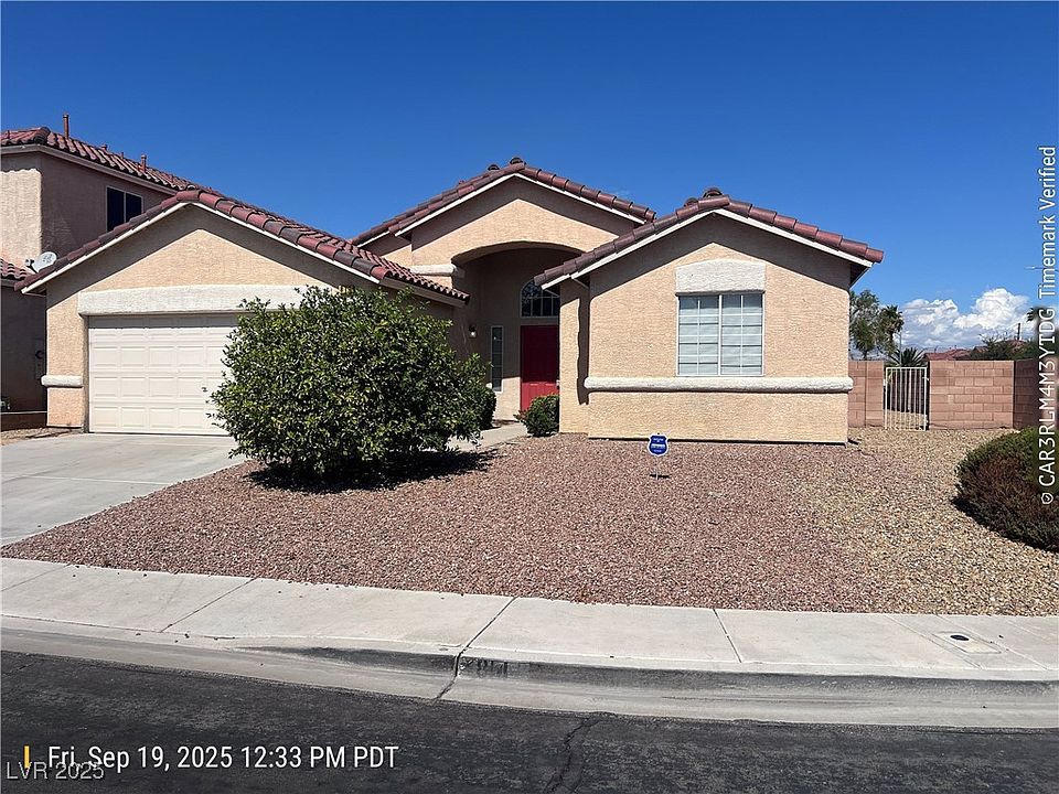 Fabulous single-story home in N. Las Vegas, situated on an ample corner lot with rock landscaping. The living room & dining room occupy a large open floor plan adjacent to the kitchen. The Kitchen has a breakfast counter, a pantry closet, and ceramic tile counters & a full complement of appliances. The primary bedroom has a walk-in closet, makeup counter, double sink vanity & separate tub/shower. There's a laundry room with hook-ups off the 2-car garage. Big backyard with a partially covered patio.