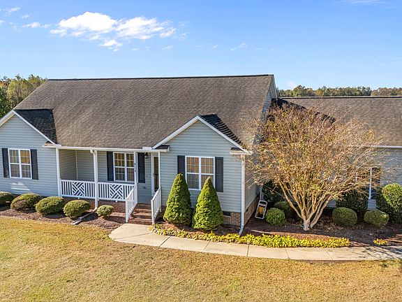 Welcome home to this lovely 3-bedroom, 2-bath residence featuring a split-bedroom floor plan and plenty of space inside and out. The inviting living room offers a cathedral ceiling and a cozy gas-log fireplace — the perfect centerpiece for family gatherings. Just steps away, the kitchen includes a stove, refrigerator, dishwasher, new built-in microwave, pantry, and a comfortable dining area. You will find a separate laundry room off of kitchen with attached shelving for storage. The spacious owner's suite features a private bath with dual vanities, a relaxing garden tub, and a separate shower. Enjoy outdoor living on the rocking-chair front porch or unwind in the cozy sun porch, which connects to the attached side-entry double garage. A detached storage building provides extra space for tools, hobbies, or equipment. Located on a half-acre lot in the county, this home offers peace and privacy with easy access to town amenities. HVAC system replaced in 2016. No city taxes!