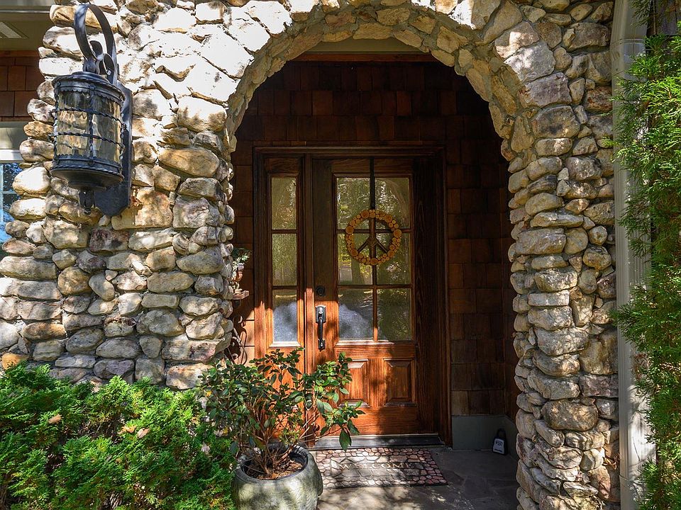 Rear entry garageStone and shake accentsSee through fireplaceSoaker tubArched stone entranceGlass block style windowTile backsplash
