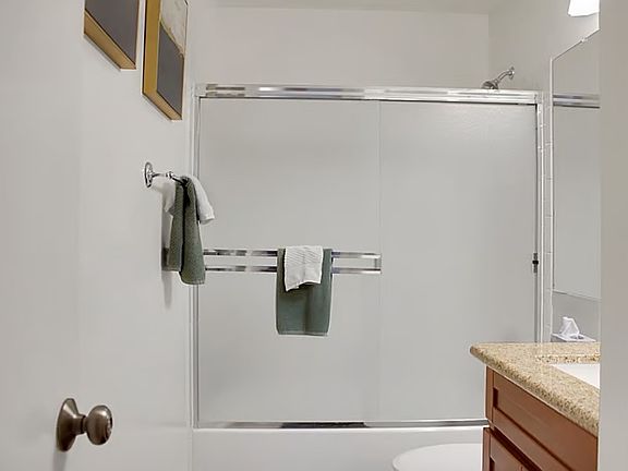 Bedroom 1 - adjacent to the guest bathroom (w/ shower and tub) offers a queen bed, closet, and 40 smart TV.