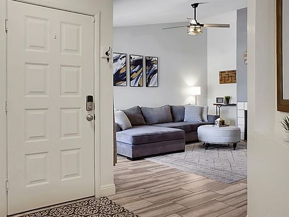 This pet friendly home is designed for traveling professionals, family gatherings, or friends who want to experience Arizona while also enjoying the comforts of home. This exceptional single-level condo features 2 bedrooms and 2 bathrooms and is rests in the charming Peoria area. The condo boasts an abundance of windows that bathe the interior in natural light, complemented by vaulted ceilings and a warm, inviting fireplace. The eat-in kitchen is a culinary delight, equipped with stainless steel appliances, granite countertops, a convenient pantry, and a breakfast bar.
