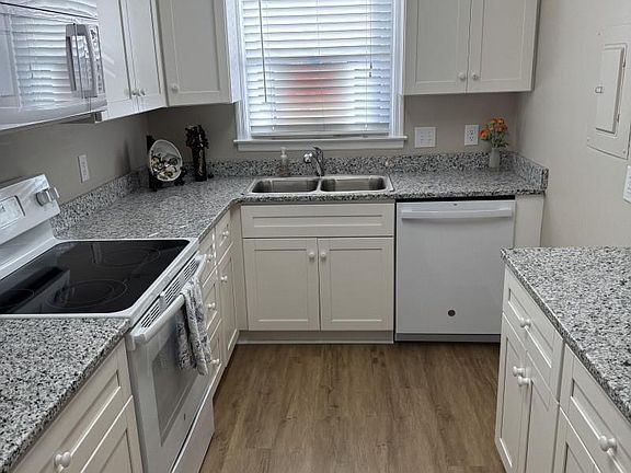 Updated condo. Shaker kitchen cabinets with soft close ,granite counter tops ,new double sink, all new lighting and ceiling fans, fresh new paint throughout, LVP flooring down stairs, new carpet upstairs, new frig and dishwasher, stove and microwave almost new, new storm door, new hot water heater, 1 yr old fence around back patio. Has a large laundry rm with storage. Condos are hidden off road very private and quiet and safe.