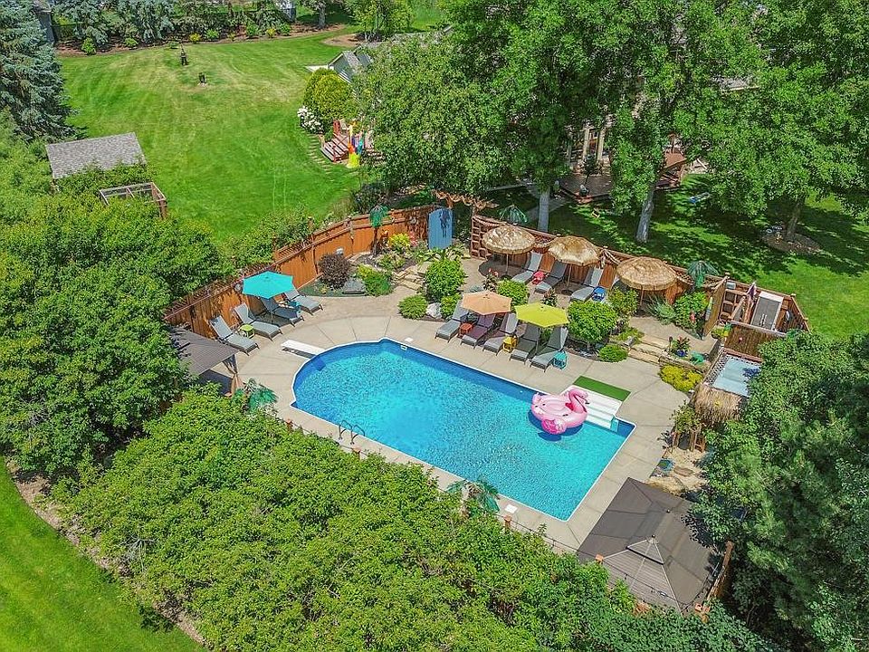 Rare opportunity to own a home in Timberwood Estates! Large 2.5-acre lot with mature trees and a creek with a bridge! Home has so many great features and living spaces - from the updated kitchen to the tropical pool area complete with realistic palm trees & a white sand tiki bar, two permanent pergolas and a shower/changing area! The oversized primary suite on upper level features two huge walk-in closets, infrared sauna, double sinks, whirlpool tub, stand-up shower, a wall of windows and a spiral staircase leading down to the three season porch. Upper level also features two additional bedrooms (one with a screened porch) and full bath (with space to add a 2nd laundry). Main floor features a huge foyer, family room, two formal dining rooms, formal living room w/fireplace, laundry/mudroom, four season porch/sunroom, three season porch, screened porch, spacious bedroom (or use as office) and 3/4 bath. Basement features a huge family room w/pool table (stays with home unless specifically excluded), large wet bar area, 3/4 bath, bonus room and workshop. You will love spending time outdoors - tropical pool area, year-round hot tub, two decks, walk-in raised garden, shed, fire pit, 6-hole frisbee golf course, practice golf range, beautiful landscaping, etc - and if that isn't enough there is easy access to nearby parks and trails. So many recent improvements - too many to list here so please see the supplements for a complete list!