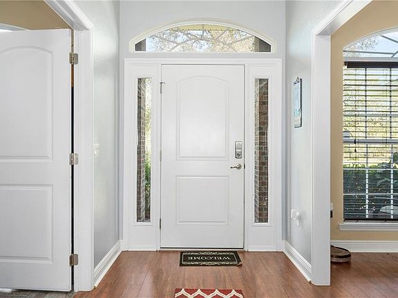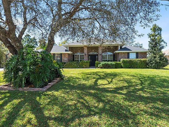 Stunning MOVE-IN READY, rare brick home with a grand front entrance boasts 4 bedrooms + den, 2 bathrooms, an outdoor living space with large paved entertainment area, inviting saltwater pool and spa, and a 2-car side-entrance garage. Situated on a private, fenced, half-acre with NO HOA and NO CDD fees. All wood laminate floors (NO carpet) provide a clean home with a spilt floor plan giving privacy to the master suite. The master bedroom has french doors to leading to the back lanai and the master bathroom is spacious with dual sinks. The kitchen has upgraded cabinets with crown molding accents and a breakfast bar with extra seating. The kitchen also has lots of counter space and is open to the breakfast nook and large great room with cathedral ceilings. Your formal dining room is off the kitchen. Enjoy relaxing on your back porch overlooking the pool and watching the sunset. The inside laundry room is oversized with a laundry tub. Seller added paved pad for BOAT/RV parking and storage shed behind the home. Also, the road was recently paved.
