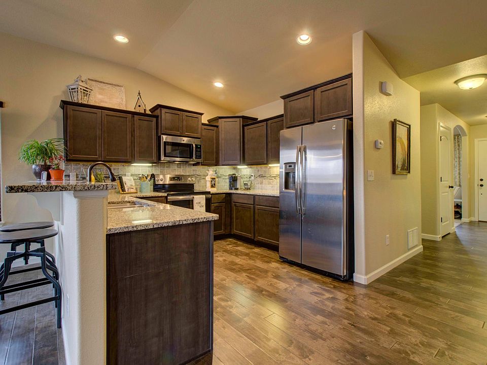 Stainless steel appliancesTravertine tile backsplashUpgraded cabinetsPrivate studyBackyard with extended patioKitchen features granite countertopsBeautiful wood laminate