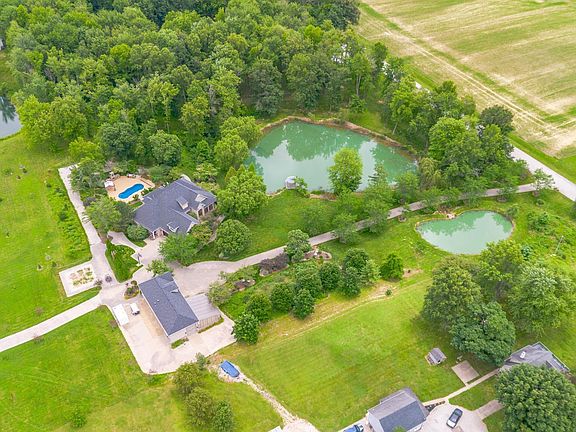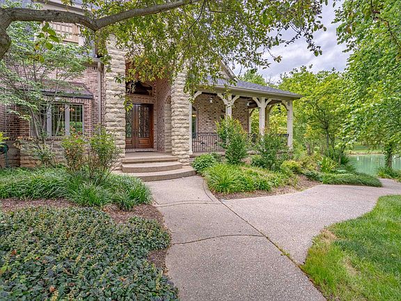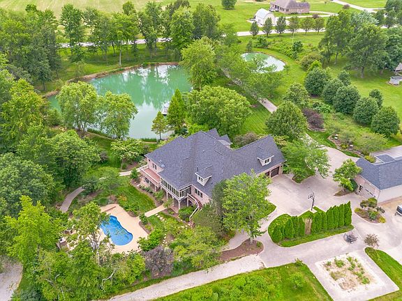 This stunning property offers an expansive living space and a lush green landscape. With over 3 acres of land, a detached garage with a greenhouse, and a private backyard oasis, it truly is a slice of paradise. The lush landscaping and wrap-around covered front porch create a welcoming entrance. As you step into the foyer, the home office space on your right and the formal dining room on your left greet you instantly. The foyer opens to the incredible living room with a gas fireplace, built-in bookshelves and great views of the yard. The eat-in kitchen overlooks the living room and offers an island with bar seating, stainless KitchenAid appliances and breakfast nook with a unique exposed brick wall. The heated and cooled sun room overlooks the whole private backyard and is accessible from the kitchen. The main floor features two spacious owner suites, each with large en suite bathrooms and walk-in closets. This layout offers convenience and privacy, making it ideal for families or guests. Upstairs, you will discover two expansive bedrooms, one of which can serve as an ideal guest quarters, a mother-in-law suite, or even a self-sufficient apartment. The downstairs basement is an entertainer's paradise with a theater room featuring a rear projector, screen, and sound system. Adjacent to the theater room is a wet bar area with a built-in entertainment center and seating space. The wine room's versatility as a potential exercise area or extra seating space is appealing. Its built-in sauna adds a luxurious touch, offering relaxation and wellness benefits. The remaining two bedrooms are at the end of the hall, one bedroom includes an ensuite bath with a laundry closet, and is accessible from the hallway. A covered patio, open deck, cocktail pool, free-standing fireplace, and outdoor kitchen with a built-in grill and beverage fridge create a true paradise. This outdoor haven offers a range of options for relaxation, entertainment, and culinary adventures. The shared pond with a gazebo is a unique spot for relaxation. The detached garage provides ample space for parking a boat and an RV, while the attached greenhouse offers an area for cultivating plants. This home truly has everything you could ever need. With its prime location and luxurious amenities, this home is truly a dream come true.