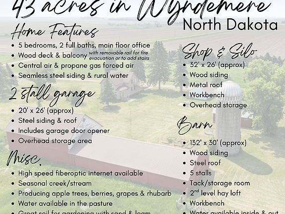 Fantastic hobby farm on 43 acres just 50 minutes south of Fargo-Moorhead! Two parcels include 5 bedroom/2 bath 2 story home with wood deck, balcony, shop (approx 32’ x 26’), silo, 2 stall garage (approx 20’ x 26’) and huge barn (approx 132’ x 30’) with 5 stalls, tack room, 2nd level hay loft and water available. Property includes garden, mature trees and shelter belt on the north and west side, with great southeast view. Many improvements include steel siding, metal roofing, central air and forced air. Main floor laundry, full bath, formal dining and office with five bedrooms up! Additional full bath in basement. Rural water with pasture water as well. Previously leased for hay and horses. Great for pheasant hunting and deer frequent the property. Wonderful producing apple trees, berries, grapes and rhubarb with good sand/loam gardening soil. Such a beautiful property in rural North Dakota to call home!