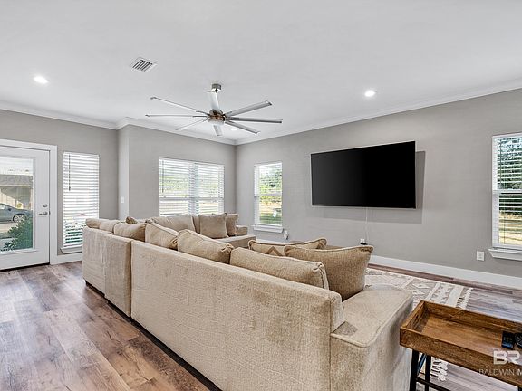 Nestled in a highly sought-after area of Foley, 8145 Carmel Circle in Bella Vista offers the perfect blend of convenience and coastal living! Enjoy being just minutes from the white sand beaches of Gulf Shores, a plethora of dining options, shopping, and entertainment. The neighborhood also offers a walking path through its center, perfect for leisurely strolls. Explore local attractions like OWA, Graham Creek Nature Preserve, Tanger Outlets, and The Wharf—all within a 15-minute drive! This immaculate 3-bedroom, 2-bathroom Gold Fortified home is perfectly situated on an exterior lot at the back of the neighborhood, providing a sense of privacy. Lightly used as a second home, this property boasts a split floor plan with luxury vinyl plank flooring throughout, recessed lighting, and elegant crown molding. The open living spaces are filled with natural light, creating a warm atmosphere. The kitchen is complete with granite countertops, stainless steel appliances, under-cabinet lighting, and an island with bar seating. A wet bar and pantry add extra functionality, making it ideal for entertaining or everyday living. The spacious master suite features a generous walk-in closet and an en-suite bathroom with granite countertops, a double vanity, linen closet, and a large, tiled walk-in shower equipped with three showerheads! Step outside to relax on the screened-in back porch overlooking a private, fenced backyard. Two gated entries on either side of the home offer ease of access and functionality. Other features include an extra storage closet in the garage, space for a mudroom, gutters on the front of the house and an irrigation system. Don’t miss this rare gem! Buyer to verify all information during due diligence.