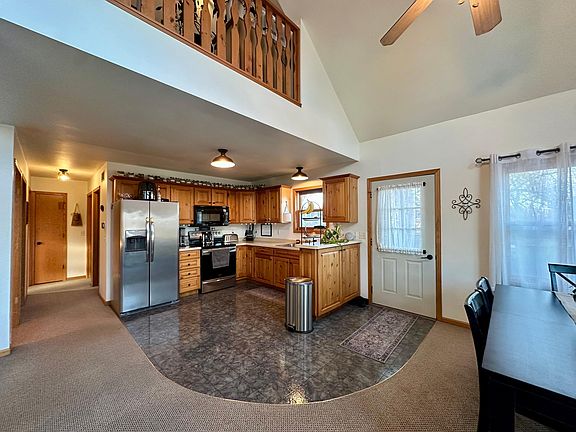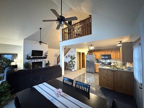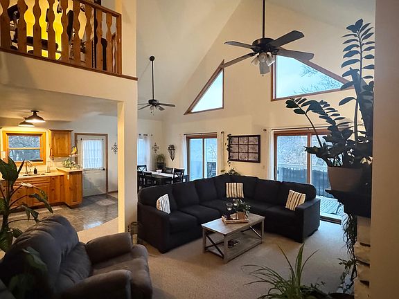 The home's open-concept living space features soaring vaulted ceilings that flood the area with natural light, seamlessly connecting the kitchen, dining, and living area, making it ideal for entertaining or quiet family memories.