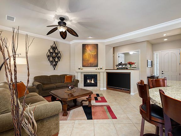 Easy and inspired living, the Caspian model is a Trilogy favorite. Comfortable and inviting, this 1,775 square-foot open concept home is energy efficient with owned Solar, soaring ten-foot ceilings, a great room with gas-log fireplace, crown molding, custom lighting, plantation shutters, gorgeous laminate wood flooring in the two bedrooms and closets, a den/office or third bedroom, and a dream garage with a two-ton air conditioner, and room for two cars and a golf cart side-by-side. Indoor, the great room, kitchen, and dining rooms flow together seamlessly, while the big picture windows bring into view the beauty of the lush backyard landscape, patio, and bubble fountain. A covered outdoor patio with fans and attached Alumawood pergola extends the joy of outdoor living well into the warmer months. It's a great place to start your day, and the best place at night to unwind. The kitchen with its grand center island and large sunlit dining room converge at the heart of the home making it the perfect place to entertain and make new memories. Cooking and entertaining is so easy in this spacious and well-organized kitchen. Energy-efficient stainless appliances that include a double oven make meal prep and serving a breeze. Abundant wood cabinets with newly installed roll-out drawers and a pantry provide plenty of storage. Durable, smooth slab granite crowns the wrap-around kitchen counters and large center island. The dining room is exceptional in size, light and open with sliding doors out to the patio. The primary suite is bright and spacious with great views, new wide plank laminate wood flooring, and plantation shutters. Dual vanities and a large walk-in shower feature stone counters and surround. The guest bedroom also has new wide plank laminate wood flooring and a full bath nearby. The laundry room has ample space and storage and comes with a washer and dryer. Make this your favorite home today!