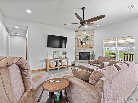 Modern comfort meets country charm in this 3-bedroom, 2.5-bath home, built in 2022 on 4 acres (mol) near I-35 in Marietta, OK! The open floor plan features a spacious kitchen with a large island, walk-in pantry, and stained concrete floors in the main living areas, with carpet in the bedrooms. Warm wood accents throughout the home add character and style. A separate laundry room offers added convenience, and the home is equipped with an on-demand propane water heater and an electric fireplace. Two bedrooms share a full bathroom, while the primary suite includes double vanities, a freestanding tub, and a walk-in shower. Step outside to a covered patio—perfect for relaxing or entertaining. A storage shed provides extra space for tools or equipment. The 4-acre (mol) lot offers plenty of room for gardening, outdoor activities, or future additions. This property is a great opportunity for anyone seeking newer construction with land and versatile outdoor space.