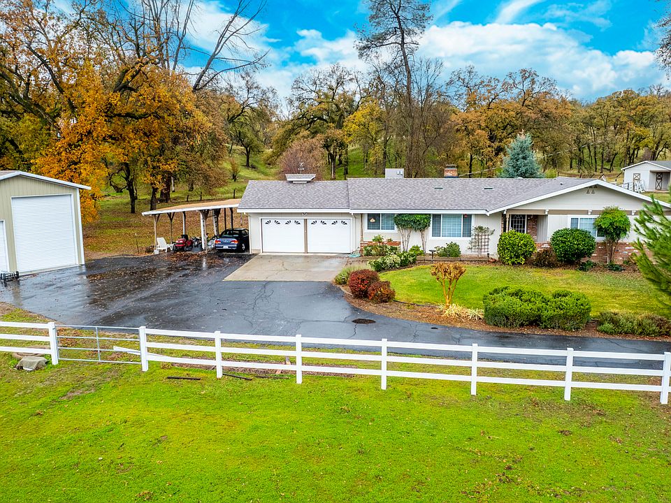 Country charmer in the highly desirable Palo Cedro area. Spacious floor plan with separate living and family rooms, COZY wood burning fireplace, bright kitchen, and sliding doors lead out to the covered back patio. Sit out back and enjoy your coffee while listening to the birds in the large private backyard. Park like setting and greener pastures for your horses to include a 3 stall HORSE BARN. 40 panel seller OWNED SOLAR, Large 2 bay, 1032 sqft, SHOP with plenty of room for boat/toys/hobbies. Room to make this house your home!