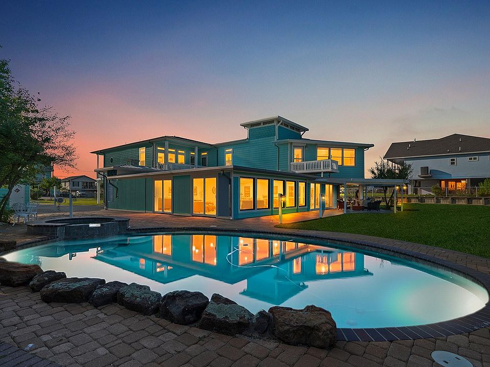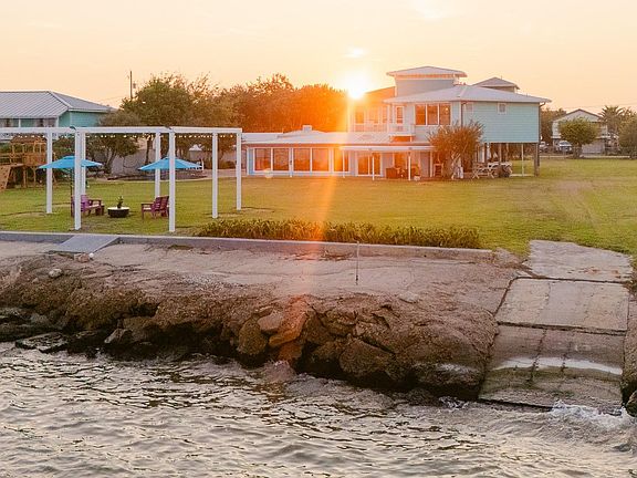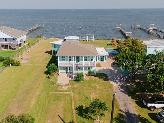 A spectacular waterfront estate on Galveston Bay featuring 7 bedrooms and 5 bathrooms, complemented with pool/ hot stub and jet ski ramp. The main house boats an open floor plan with high ceilings, an elevator, and balconies, creating an expansive and inviting living environment. The Primary bedroom offers stunning views of the bay, a walk-in closet, and an ensuite bathroom featuring a sand alone tub and walk in shower. The gated property is beautifully landscaped with mature trees and includes a designed spot for RV parking.
