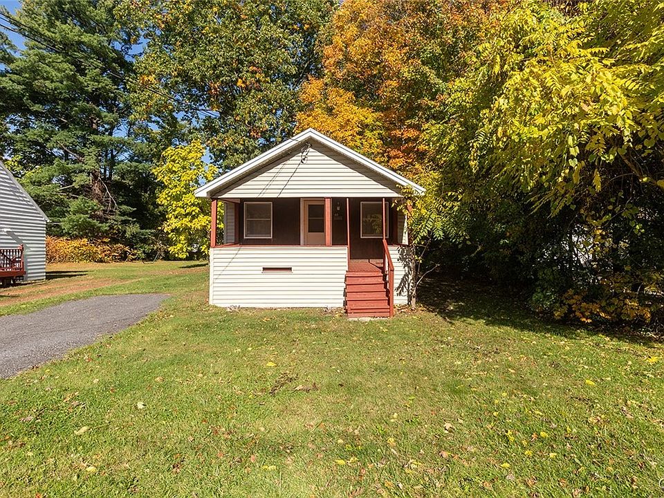 Cheaper than rent! Ranch style one bedroom home boasts spacious livingroom, eat in kitchen with adorable bench and table, refrigerator and dishwasher, gas/oven range 2025, freshly painted cabinets, updated bathroom, glass block windows in basement 2025, shed, front deck, central air, vinyl siding and newer roof.