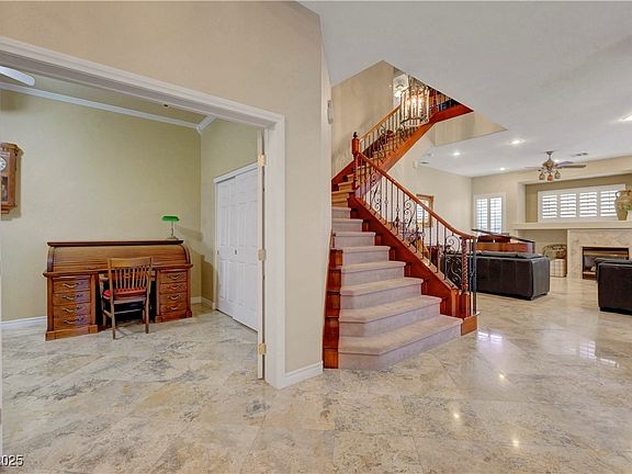 Enjoy the flexibility of a bedroom and den downstairs. The primary suite features dual vanities, walk-in closet, & resort-style spa shower. Enjoy your own private oasis with a sparkling pool, relaxing spa, & spacious yard—perfect for gatherings or quiet evenings. Prime location close to The District at Green Valley Ranch, Trader Joe’s, parks, & walking trails. Easy access to dining, shopping, & major roadways.