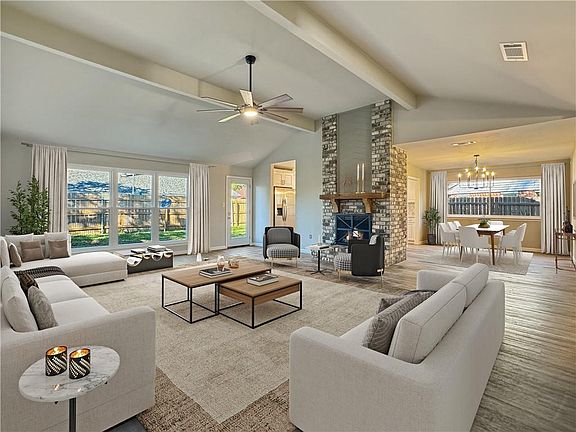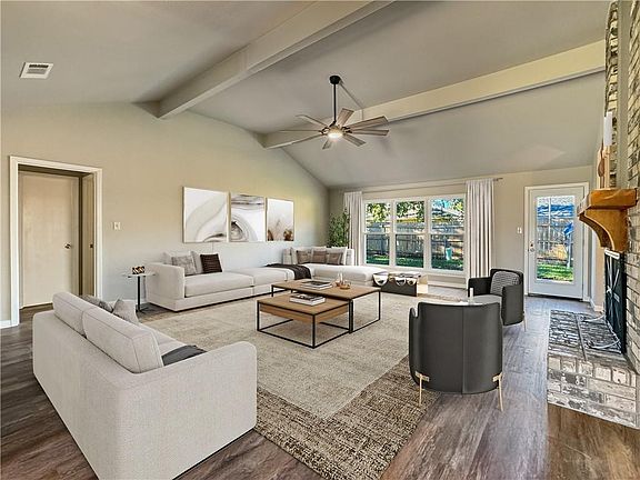 As you pass through the cozy foyer you enter the expansive main living area, complete with vaulted ceilings a charming farmhouse style ceiling fan and brand-new vinyl plank flooring and tile throughout. The striking brick fireplace, with its rustic cedar mantle, serves as the focal point of the room. The home is bright and airy, with no popcorn ceilings and a neutral color palette that compliments every style.
