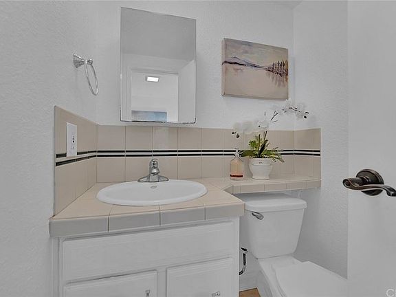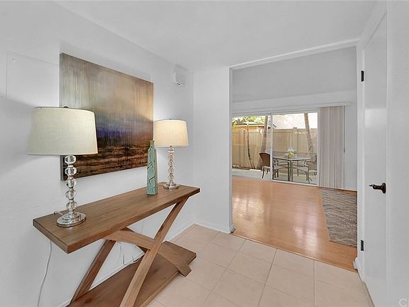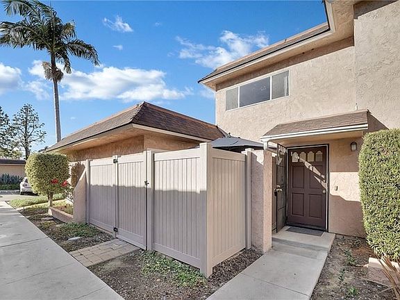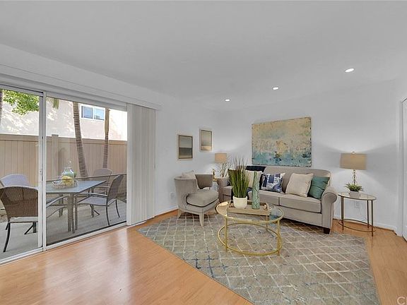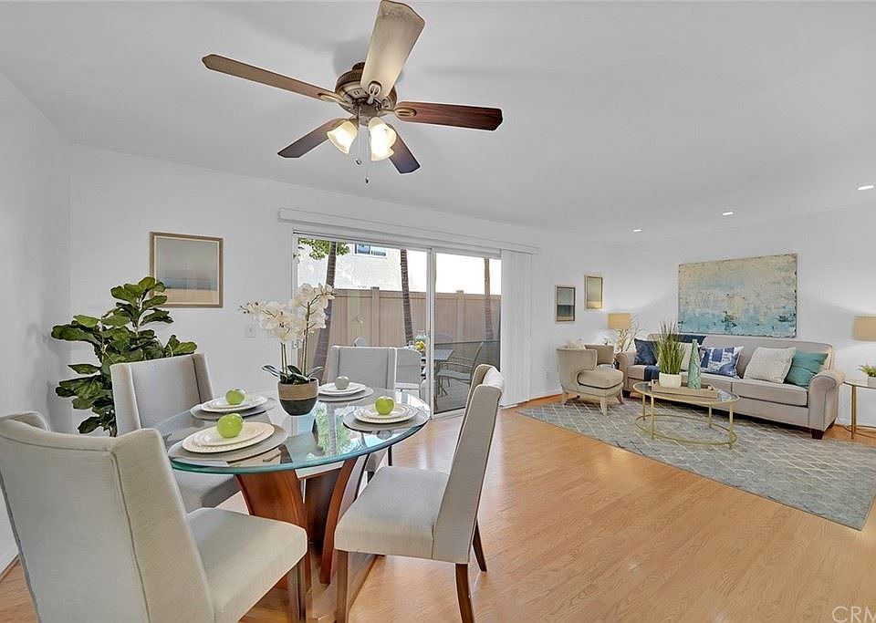 Welcome to this bright 2-story condo in the Fashion Knolls community! This home features an open floor plan living area, which includes Living Room, Dining Room and Kitchen on the first floor. It has a half bath on the first floor, two spacious bedrooms with beautiful Birch hard wood flooring and a full bathroom on the second floor. The Dining Room has a large slider that leads to PRIVATE outside patio access with beautiful palm trees, as well as access to one of the community greenbelts. Newer water heater, entire interior of property is freshly painted, upstairs vanity and shower/tub have been glazed and shine! Washer/dryer hook-ups for a stackable laundry in storage/utility closet, as well as a shared laundry room w/ 3 other homes. Bottom level location, no one above or below. Single-car, detached garage (very close) and dedicated single parking spot. HOA includes water, trash, pool (close to condo), the ability to rent community recreation room and green belts throughout the community. Numerous convenient shopping options and freeways nearby. This property is great to live in or as an investment. Property is staged. Welcome Home!
