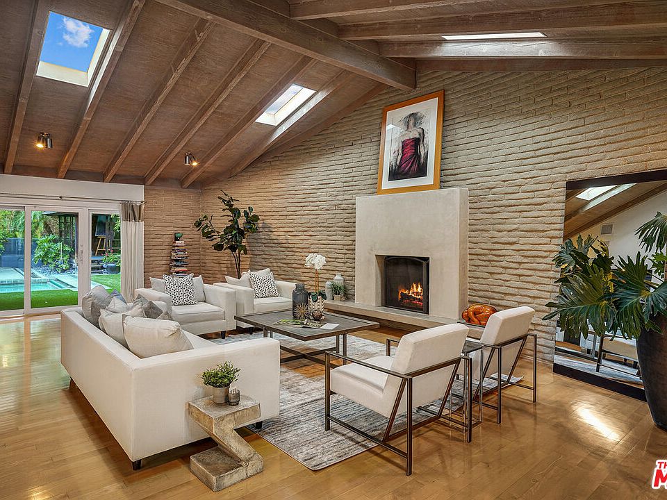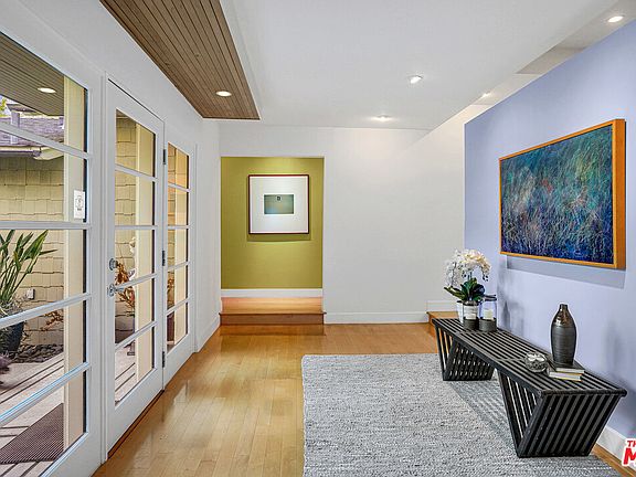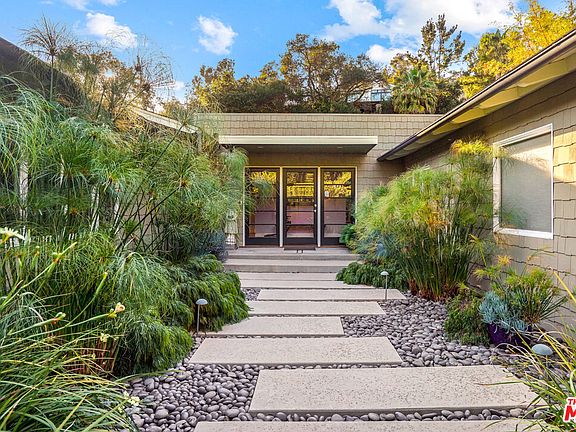 Situated in Crestwood Hills, this secluded, single-level retreat offers a serene oasis surrounded by immaculate landscaping featuring a circular meditation garden, Frank Lloyd Wright Garden Sprite sculpture and fruit-bearing Pasha Lime Trees. Beyond the lush courtyard, the home's formal entry opens to reveal a light-filled great room with immense living space beneath vaulted ceilings, state-of-the-art kitchen complete with skylights, dual islands and Brazilian soapstone countertops, flowing seamlessly onward to the dining area with direct access to a covered patio. The right side of the home offers a powder bath and private guest suite with its own courtyard, while the left offers a media room, two secondary bedrooms and the luxe primary suite featuring a walk-in closet, spa-like bath, sitting area and glass doors to the backyard. Outside find ultimate seclusion amidst a nature-steeped setting with a pool and spa with an automatic cover, sun deck and a dreamy bungalow crafted in Bali -- the ideal space for an artist's studio, yoga room or lounge. Conveniently located yet seemingly a world away, this home provides a true LA sanctuary.