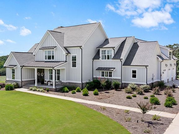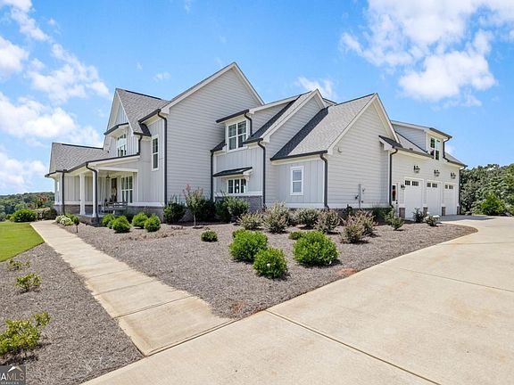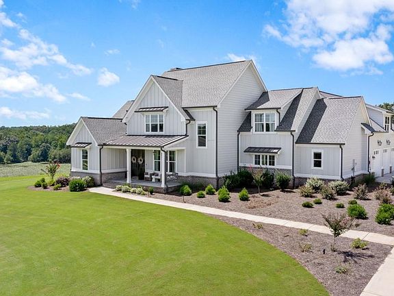 Welcome to this stunning home perfectly situated on 5 private acres within a gated community, offering breathtaking lake views and ultimate privacy. The large covered front porch with stately columns sets the tone for the charm and elegance found throughout. The private owner's suite is conveniently located on the main level, featuring a spa-like bathroom with double vanities, walk-in shower, soaking tub, and private water closet. The gourmet kitchen is designed for entertaining, complete with a spacious island topped with quartz countertops, stainless steel appliances including a gas cooktop, wall oven, microwave, dishwasher, and built-in beverage storage. A walk-in pantry provides ample space to keep everything organized. Enjoy seamless open-concept living with views from the kitchen into the family room, where a beautiful fireplace, custom bookshelves, and access to the covered back patio create the perfect gathering space. Upstairs, you'll find three additional bedrooms plus a finished bonus/bedroom with a full bath-ideal for guests or flex space. This home showcases a high-end trim package and gleaming hardwood floors in the foyer, office, family room, kitchen, and dining area. There is also an option to purchase an additional 5+ acres directly adjacent to the property for those seeking even more space.