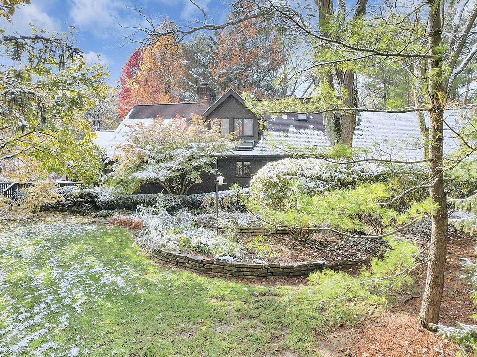 On the first floor, you'll find an expansive living room with a gas log fireplace and abundant natural light, a sunny kitchen equipped with granite countertops and an island/breakfast bar, a formal dining room, built-in pantry, sunroom/breakfast room, laundry room, and half bathroom. The private primary suite features a study with built-in bookshelves and gas fireplace, soaking tub with skylight, sliding doors to the deck, a walk-in closet, and a gentleman's closet.