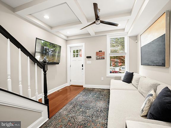 Welcome to this stunning end-of-group rowhome in the heart of Canton! From the moment you step inside, you’ll be greeted by charming coffered ceilings, gleaming hardwood floors, and a fresh neutral color palette that sets the tone for the entire home. The main level features a spacious living room, a separate dining area, and a convenient half bath. The gourmet kitchen takes center stage with white cabinetry, quartz countertops, stainless steel appliances, a striking marble herringbone backsplash, and a large center island beautifully accented with pendant lighting. Just beyond, your private rear patio awaits; a courtyard-inspired retreat perfect for growing your herb garden, grilling, or enjoying a quiet evening outdoors. Upstairs, you’ll find two generously sized bedrooms and two tastefully renovated bathrooms. This level also offers a private entrance to the rooftop deck, where sweeping Baltimore city views provide the ideal backdrop for relaxing or entertaining. The fully finished lower level offers incredible versatility with a third bedroom featuring a Murphy bed, a full bath with a tub, and additional living space; perfect for guests or a home office. Recent updates include the marble backsplash (2021), two renovated bathrooms (2022), Trex deck (2021), HVAC (2018), and a new water heater, range, and microwave (2025). With its modern upgrades, versatile living spaces, and unbeatable location, this home is truly move-in ready. Don’t miss your chance to own this Canton gem—it has everything you’ve been looking for!