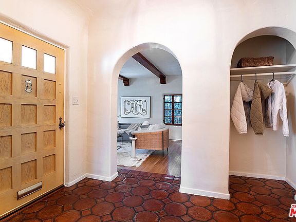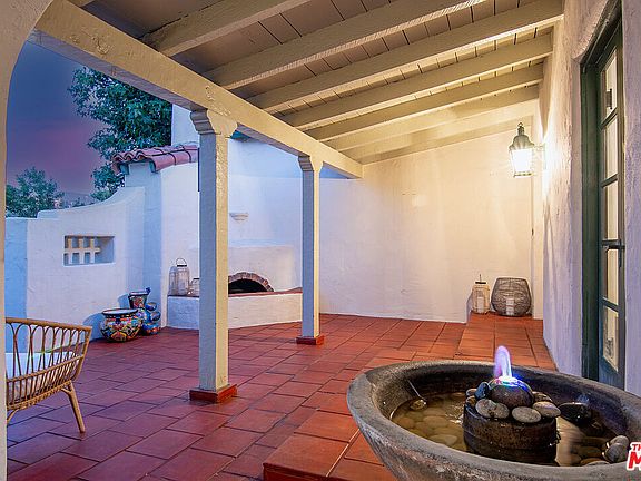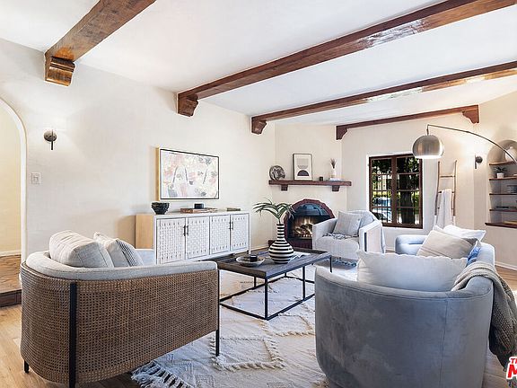Nestled on a quiet cul-de-sac in the prestigious Miracle Mile Museum Row neighborhood, this 1920s Spanish-style home blends timeless charm with modern upgrades. Hardwood floors and wood beam ceilings grace the spacious living room with a cozy fireplace and adjacent formal dining room, both featuring elegant arched doorways. The gourmet kitchen includes an eat-in breakfast area, large pantry, and high-end appliances (Wolf gas range, Fisher & Paykel dishwasher).The main bathroom offers a separate bathtub and shower with glass blocks for natural light. The master bedroom features a walk-in closet and direct access to a serene courtyard. Two additional bedrooms provide ample space and storage, with the rear bedroom accessing a private bathroom with a shower. The lushly landscaped courtyard includes a hot tub, perfect for relaxing evenings, while a gated front patio with a decorative fireplace and a secure driveway add charm and privacy.Steps from world-class museums (LACMA, Academy Museum, Petersen Automotive Museum), shops, and dining, this home sits within the Miracle Mile Historic Preservation Overlay Zone. Free from through traffic, it offers a rare blend of comfort and sophistication.