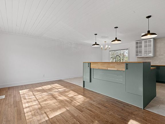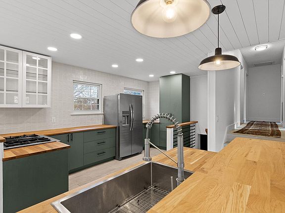 The freshly painted main level offers an open-concept layout where the kitchen, dining, and living areas connect under a charming shiplap ceiling. Ample natural light fills the space through recently replaced windows and recessed lighting. The remodeled kitchen features sage green cabinets, butcher block countertops, a Zellige tile backsplash that extends to the ceiling, stainless steel appliances, an oversized stainless steel single basin sink, an appliance garage, and bar seating at the island that flows seamlessly into the dining area for everyday meals or entertaining.