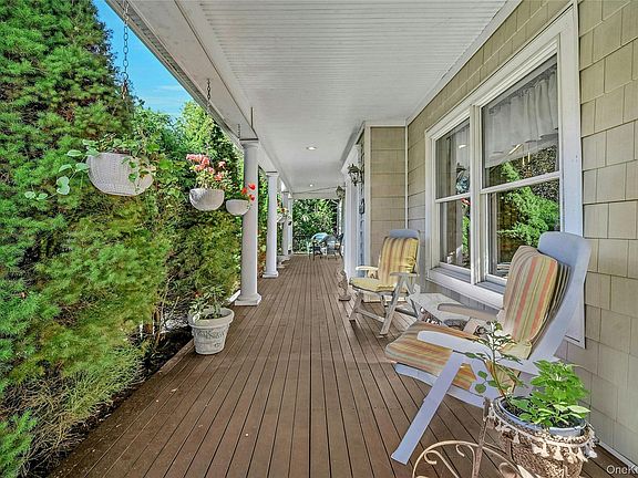 Two story, 4 bedroom, 3 1/2 bathroom Nantucket style residence in sought-after Orient By-The-Sea. Perfect for year-round or vacation living. Covered mahogany wrap porch welcomes you to this light, open and spacious home that is perfect for entertaining, holiday gatherings, and cozy family time. Living room, great room, formal dining room, large kitchen with informal dining area. Wooden floors, light-filled. Great room has a vaulted ceiling and floor to ceiling gas stone fireplace and hearth, huge windows and transoms. Great room opens to gracious rear covered porch with ceiling fan and skylights, providing shade and "cover" while also permitting natural light. Great room, kitchen, and porch overlook the gorgeous level rear yard. This home features two spacious primary ensuite bedrooms, one on the main level and a second primary ensuite on the second level. A laundry room and powder room complete the main floor. A balcony walkway overlooks the great room from the second floor. Primary ensuite, two additional bedrooms and a full hall bathroom with an additional bonus space with windows and skylights complete the second floor. Attached two-car garage. The level shy acre property offers a serene, private landscape of lawn, mature specimen plantings and plenty of room for a swimming pool. The Cross Sound Ferry, Orient State Park, and Duryea's Restaurant are close by. The beautiful, well-maintained association sound beach, with a stone path, picnic area, and brick barbecue is just around the corner. A very special opportunity to live and enjoy life on the North Fork, from a coveted Orient location.