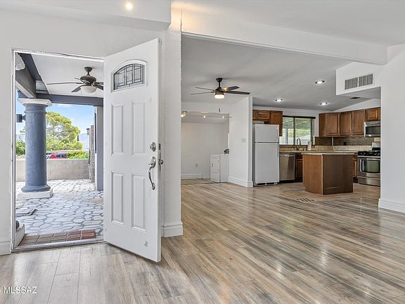 Welcome to this beautifully updated desert retreat backing to pristine desert with sweeping views. A landscaped front yard, lush garden, and mature fruit trees producing twice a year create a special setting. Inside, enjoy central A/C plus a mini split in the primary bedroom, energy-efficient windows, and a luxurious primary with its own entrance. The primary bath includes an electric water heater, bathtub, and dual-vanity sink. The second bath features a walk-in shower, freestanding clawfoot tub with mounted TV, and a gas water heater. Another bedroom also has a separate entrance. Outside, a kitchen with TV, smoker, BBQ, and sink sits beside a tranquil pond, turf areas, and a block wall. A durable metal roof and quality upgrades ensure comfort and low maintenance.