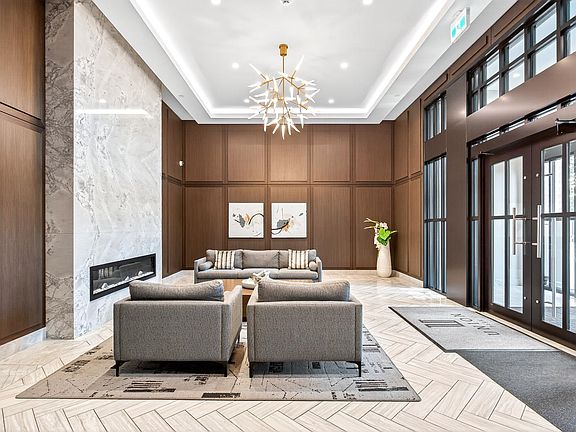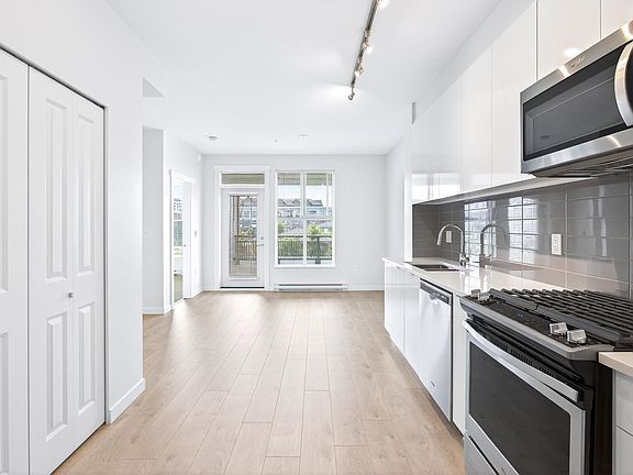 WELCOME TO THIS BEAUTIFUL WEST FACING UNIT! In move in condition, freshly painted and with brand new laminated floors, open plan with 9 ft ceilings. The kitchen features quartz counters, designer 16x3 inch backsplashes, gas stove, stainless appliances, undermount sink. Spacious living room with access to a 11x6'7 covered deck, lovely views of the community garden and court yard. How perfect it would be to have cocktails or a BBQ on this private deck with no one looking back at ya. The Spic and span bathroom is complete with a soaker tub. MULTIPLE AMENITIES: Pool, basketball court, hot tub, exercise room, covered BBQ area, 1 parking spot, and the storage locker is on the same floor as the unit and across the hallway.ROUGHED IN EV CHARGER!