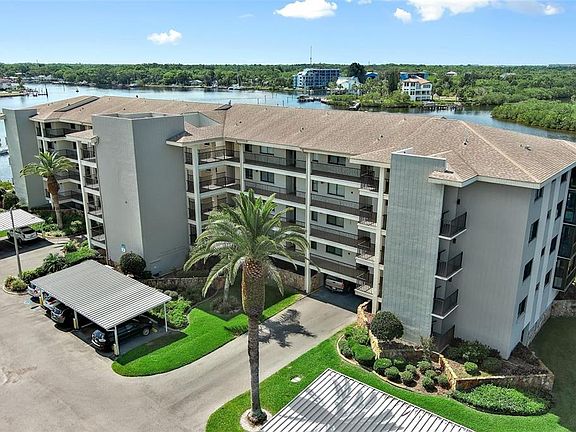 This waterfront condo is located in the much desired SAND PEBBLE gated community. The community is well maintained and has so much to offer. 24 hour gate guard, waterfront boardwalk, new clubhouse with fitness, library, game tables, card room, tennis, pickleball and multiple pools with cabanas and gas grills. This condo offers gorgeous views of the Pithlacascotee River from almost every window with partial Gulf view as well. Updated kitchen, great room with waterfront view and sliding door access to the enclosed lanai, updated baths, large guest bedroom, master bedroom with access to the enclosed lanai, vanity, walk in closet and en suite bath with walk in shower. AC new in 2021, Washer and Dryer new in 2022. Sliding doors are storm rated. One under building parking space reserved and storage locker. SAND PEBBLE is close to waterfront dining, historic downtown restaurants, theatre, night life, Sims Park (festivals and activities), approx 20 min to Tarpon Springs Sponge Docks and Fred Howard Park, approx 40 min to Caladesi Island and Honeymoon Island, approx 60 min to famous Clearwater Beach, approx 60 min to Tampa airport, Tampa Cruise port, Sports Arenas, Theatre, Theme Parks, Nightlife and Shopping! NO PETS. NO SMOKING. NOT AGE RESTRICTED. Dues $990.80 (This breaks down to: $468.40 toward insurance and $522.40 for maintenance of amenities and community). Includes: trash, cable, internet, use of grounds and amenities, flood and hazard insurance on the building, escrows, security, management. Call to schedule your private showing. This one will not last long.