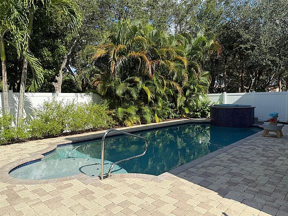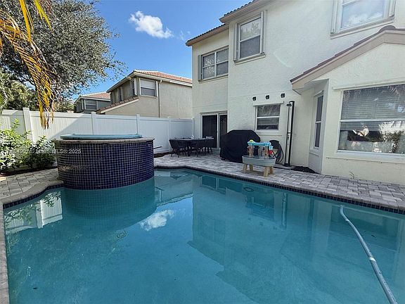 Welcome to your private South Florida Oasis- with a heated saltwater pool with a waterfall, an oversized lot, an outdoor shower and amazing Tiki hut for shade and privacy! 2 car garage, and everything you need for a comfortable lifestyle. 3 bedroom + 2.5 bathrooms, upstairs den has been converted into a 4th bedroom, plus an office space downstairs with sliding glass doors that can be used as a guest bedroom. Large custom-built walk-in closet in the master bedroom plus another walk-in closet in the guest bedroom. Hurricane shutters. Nautica gated community has a low HOA fee and offers a heated pool, clubhouse, gym, tennis, basketball, pickleball courts and social events. A must see!