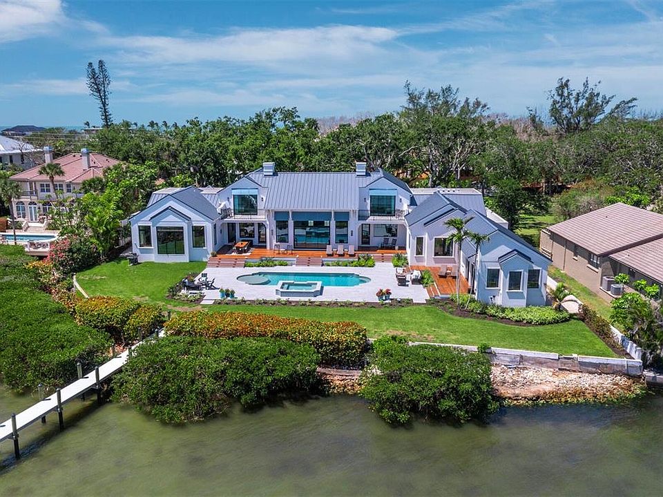 Welcome to one of the most impeccably reimagined residences at 8155 Midnight Pass on the quiet southern end of Siesta Key — a breathtaking bayside coastal estate that artfully blends modern innovation with timeless design. Set on nearly an acre of prime waterfront with 154 feet of shoreline, this gated property offers just under 7,500 square feet of luxurious living area with more than 9,200 total square feet of combined living and entertaining space, recently transformed through a full-scale two-year architectural renovation by Braidenview Architects and Christner Brothers — winners of the 2024 Aurora Grand Award for Best Renovated Home. From the moment you arrive at the gated motor court, you’ll be struck by the serenity of the grand live oaks, artistically designed landscaping, and elegant curb appeal. Inside, the home, with classical proportions, opens to soaring ceilings, DuChateau European oak flooring, and thoughtful details at every turn — from custom cabinetry and designer lighting to Euro-Wall sliders and state-of-the-art automation by Coastal Smart Homes. The heart of the home features multiple expansive living areas, all with views of Little Sarasota Bay and the Intracoastal Waterway from nearly every room, a show-stopping kitchen outfitted with Wolf and Sub-Zero appliances, double islands, and a butler’s pantry make for effortless entertaining. With four bedrooms, 2 of which offer additional sleeping areas in the suites, six baths, a private gym, a large office with two separate workspaces, a sewing/project room, and bespoke closets throughout — every space is both beautiful and functional. Step outside to enjoy a reimagined resort-style pool and new spa, Brazilian IPE decking, and multiple areas to savor sunsets over the Intracoastal Waterway. For boating enthusiasts, there is an impressive 200-foot dock with lift to accommodate a 25’ vessel plus an additional mooring area. Whether hosting a family celebration or simply savoring the coastal breeze, this property is designed for making lasting memories. Plus you are minutes from Siesta Key beach when you want to take a walk and put your toes in the famed quartz-sand as you watch the sun disappear into the horizon. With Sarasota’s vibrant cultural offerings, shopping and dining just moments away, you are all set to enjoy every imaginable amenity for an impressive lifestyle.