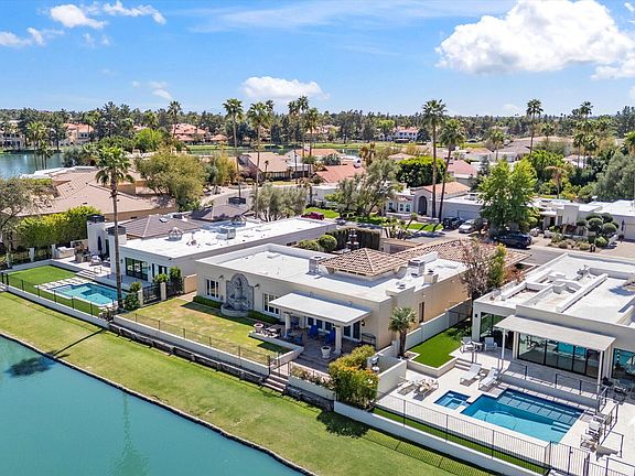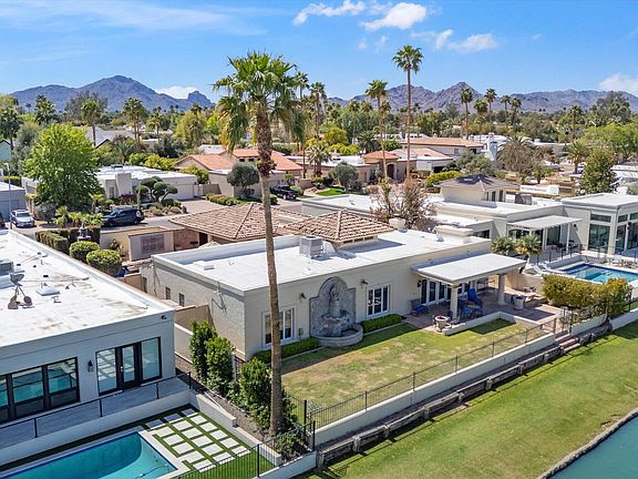 Enter through the resort like courtyard with a sparkling blue pool and a towering water fountain. Once you step inside you will find a spacious and light-filled interior featuring soaring entryway ceilings with an enormous chandelier, large windows and doors that frame the courtyard and the stunning lake views out the back of the home, and two fireplaces. Boasting two bedrooms + a den that can easily be converted back to a third bedroom, 2.5 bathrooms, and 2,853 square feet of living space, this home offers plenty of room for relaxation and entertaining. Enjoy seamless indoor-outdoor living with a spacious covered patio with direct access to Marguerite Lake perfect for morning coffee or sunset gatherings, and lushly landscaped backyard. The chef's kitchen features blue Bahia granite countertops, stainless steel appliances including a Sub-Zero refrigerator, and custom Cherrywood cabinetry; while the primary suite offers a peaceful retreat with views to the courtyard, a spa-like ensuite bath, and a custom California Closets walk-in closet. Situated in the heart of McCormick Ranch in the highly coveted "Del" streets, this home provides easy access to the greenbelt, walking and biking trails, top-rated schools, premier golf courses, shopping, dining, and entertainment. This property has been lovingly cared for and is ready for its next chapter. Don't miss out on this rare lakefront gem!