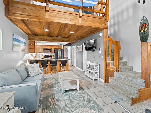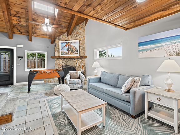 Enjoy the ultimate coastal lifestyle steps from the beach! This beautifully updated and furnished 2 bed, 2 bath, end unit townhome is an active Airbnb with strong income potential and allows one-week minimum rentals with NO HOA, NO PET RESTRICTIONS! Relax in the vaulted living room with wood ceilings and a cozy stone fireplace. The kitchen features granite countertops, stainless steel appliances, and a breakfast bar for casual dining. Both bedrooms have private bathrooms and access to private patios. The second bedroom is a charming loft-style space with balcony. Step outside from the primary to a screen-enclosed patio with a hot tub, ideal for relaxing while soaking up the Florida breeze in privacy. Minutes from Port Canaveral, dining, shopping, and entertainment, this turnkey townhome invites you to embrace a vibrant coastal lifestyle or start generating rental income from day one! Schedule a private showing today!