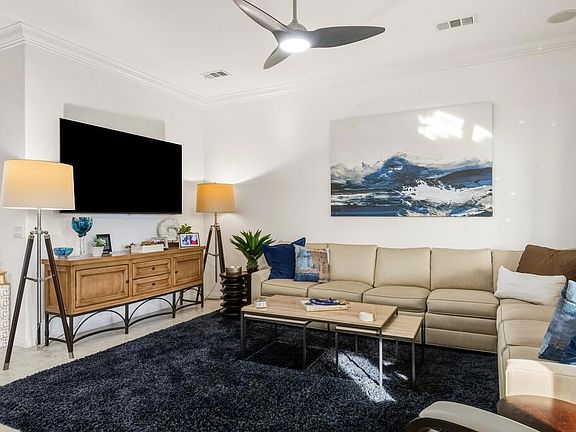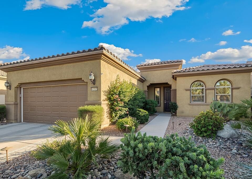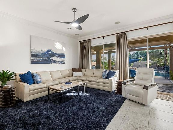 Welcome to your own private oasis in the desert. This very rare extra large no rear neighbors backyard is a true gem. The brand new swimming pool with jacuzzi enhances the oasis resort feel landscape. The custom water feature adds to the zen feel of your backyard. All brand new Pentair state-of-the-art pool equipment powered by a simple click on your cellphone was installed just in September 2025! This immaculately kept highly upgraded home has just been repainted in a classic white color. Clean and bright! A brand new osmosis soft water system was just installed summer 2025. To keep your car and stored garaged items cool in your epoxy floored garage, a brand new garage air conditioner split was installed September 2025. You will feel right at home in this beautiful 2 new carpeted bedroom 2 bath with den home. Plenty of room for clothing in both walk in closets. Plantation shutters and new ceiling fans throughout. A brand new refrigerator and dishwasher was just installed too. This beauty sits on a cul de sac near the Security gate. Don't let this gem of the desert pass you by.