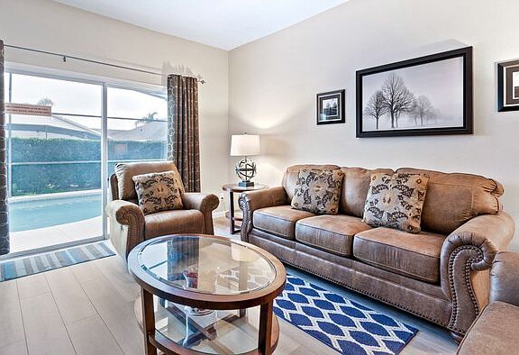 This property is a corporate rental. Please note that the monthly rental price for this property is dynamic and subject to seasonal adjustments. For an accurate quote, provide us with your intended move-in and move-out dates. Windsor Palms Resort Vacation Home - includes resort clubhouse amenity access! Our 4-bedroom, 2-bathroom, private vacation home is a great option for families wanting a home base to enjoy the best of all that Central Florida has to offer. * Windsor Palms Resort Private Pool Home, Sleeps up to 8 * 4 bedrooms / 2 bathrooms * Private Pool - South-facing for Maximum Sunlight throughout the day * Game Room * Windsor Palms Resort Gated Community * 4 miles to Disney World property * Fully equipped Kitchen with dining for 6 at the dining table, with an additional breakfast nook for 4 BEDROOMS (All Ground Floor) - Master Suite 1: One Queen Bed / Attached Bathroom - Bedroom 2: One Queen Bed - Bedroom 3: Two Twin Beds - Bedroom 4: One Twin Bed over One Twin Bed (Bunk Bed) A pack\'n\'play is available for use as well. Pool Charges and Information: * There is an additional optional charge of $30 per day plus tax to heat the pool. * Please note that our pools are serviced on a weekly basis. Resort Parking Rules: The resort allows a maximum of 3 cars. Please pick up parking rules at guard gate. Parking is strictly enforced. Do not block the sidewalk or park on the street or the resort may tow. 3rd car needs to be parked parallel to the driveway to not block the sidewalk. No motorcycle parking is allowed at this resort. Windsor Palms Resort Amenity Access Included with Rental: * Huge resort-style pool with sun deck * Luxurious hot tub * 58-seat movie theater * State-of-the-art fitness center * Children\'s playground * Sand volleyball * Basketball courts * Tennis courts * Video arcade and billiards Distances from Resort to Shopping & Attractions: * Walt Disney World - 4 miles * Universal Studios - 17 miles * SeaWorld - 15 miles * Orlando Airport - 28 miles * Atlantic Coast Beaches - 75+ miles * Gulf Coast Beaches - 88+ miles * Publix Supermarket - 4 miles * Walmart - 2 miles * Dining - 2 miles Why Choose this Rental? * Professionally managed to serve all your needs * Management company has over 26 years of experience hosting well over 200,000 families * Go straight to your rental with online email check-in * 24/7 on-call maintenance * No Resort Fees * Free On-Site Parking * Smoke-free and pet-free for your comfort * Towels and linens are provided * Complimentary WiFi * Additional Rental items Available (e.g., 3 & 4 burner BBQs, cribs, pack-n-plays, strollers, high chairs, etc.) Our starter welcome packet supplies: * 2 rolls toilet paper per bathroom * 2 round hotel-size bar soap per bathroom * 1 hotel-size shampoo/conditioner per full bathroom * 1 roll paper towel * 1 packet dishwasher detergent * 2 trash bags size-13-gallon * 1 small box laundry detergent (enough for one load) * Garbage can liners in each bedroom/bathroom small garbage cans Any supplies beyond this are up to the guest to replenish, we do not restock these items. No salt/pepper or cleaning supplies are stocked due to safety issues. This is an industry-standard practice. FOR GUESTS WHO BOOK 30 NIGHTS OR LONGER STAYS: (this does not apply if you are staying less than 30 nights) We will collect a $1,500 deposit. Balance is due 60 days prior to arrival If canceled 90 days or more before arrival, we keep with us $250.00. $1,250.00 will be refunded. If canceled between 61 and 89 days prior to arrival, we keep with us the $1,500.00 deposit. No cancellation or modification 60 days or less prior to arrival. Contact us to schedule a showing.